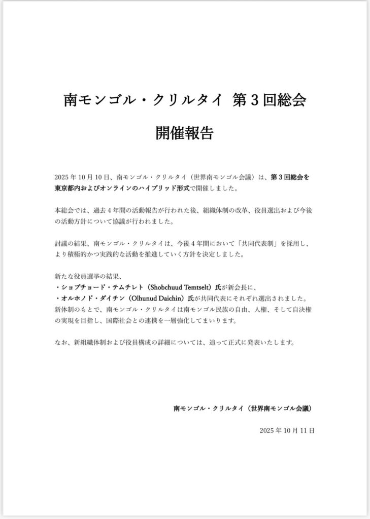 2025年10月10日、南モンゴル・クリルタイ(世界南モンゴル会議)は、第3回総会を東京都内およびオンラインのハイブリッド形式で開催しました。