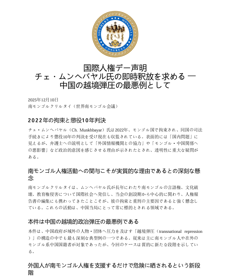 2025年12月10日、国際人権デーにあたり、南モンゴルクリルタイ(世界南モンゴル会議)は、現在モンゴル国で収監されている副会長 チェ・ムンヘバヤル氏(Ch. Munkhbayar) の即時かつ無条件の釈放を強く求める声明を発表しました。