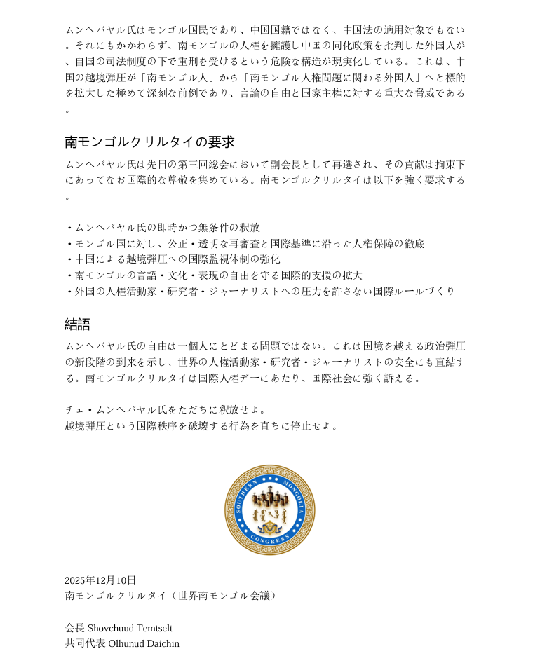 さらに、南モンゴル人権問題に関与する外国人までが危険にさらされている現状に深い懸念を示し、モンゴル当局には公正な再審査と国際基準に沿った人権保障を、中国政府には越境弾圧の即時停止を求めています。