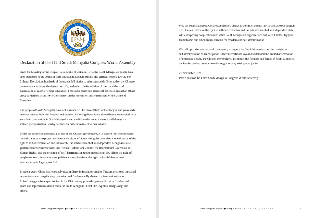本声明は、**南モンゴルクリルタイ(世界南モンゴル会議)**が、