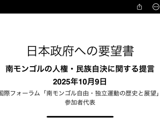 日本政府への要望書 ― 南モンゴルの人権・民族自決に関する提言 ― (2025年10月9日 国際フォーラム「南モンゴル自由・独立運動の歴史と展望」採択) 2025年10月9日、東京で開催された国際フォ …
